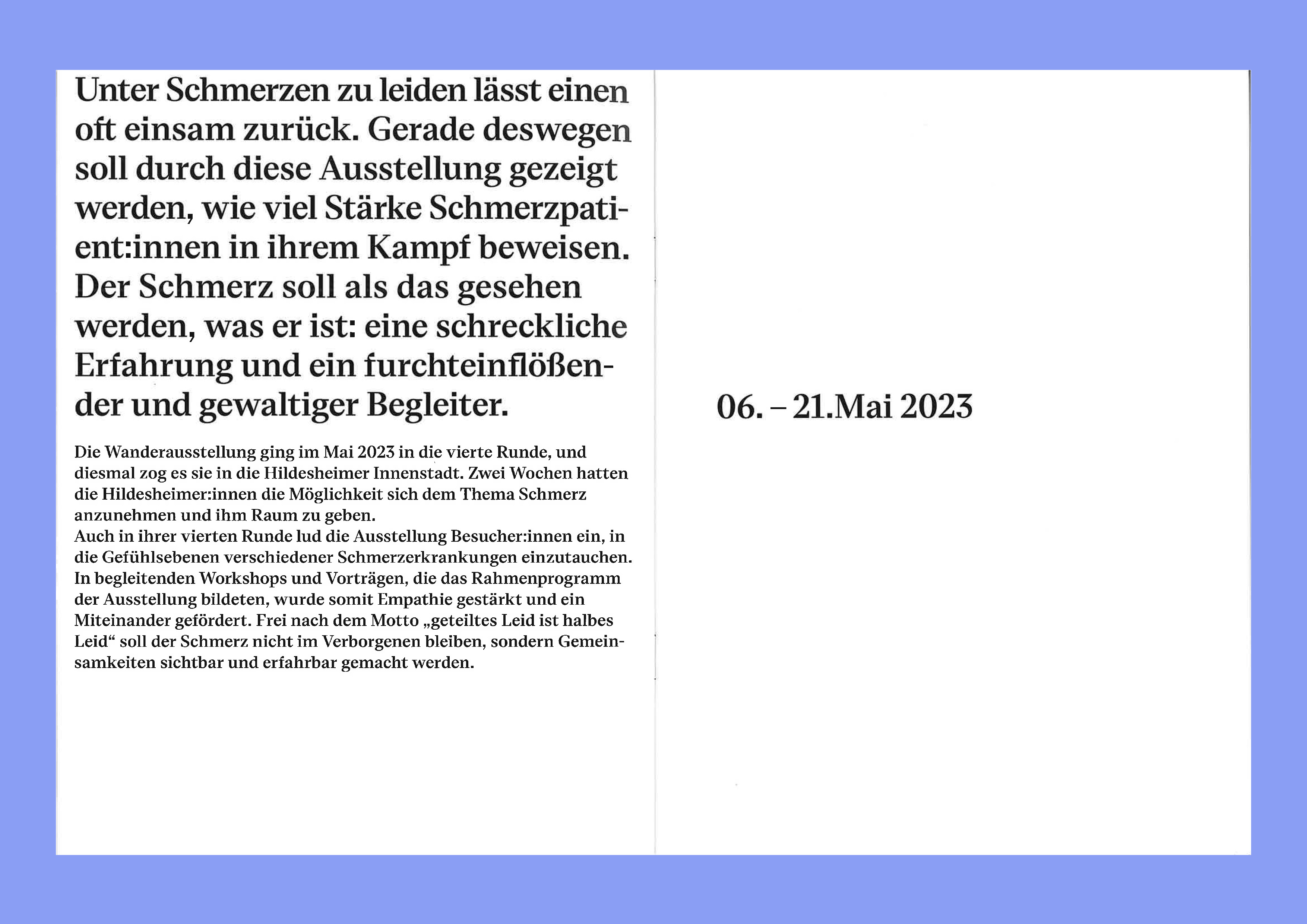 Der Schmerz hinterlässt tiefe Abdrücke, sowie auch das Leben Spuren hinterlässt. Je öfter und stärker der Schmerz ist, desto nachhaltiger frisst er sich in die Biografie der Betroffenen. Das Leben enthält immer tiefer gehende Abdrücke und Prägungen.