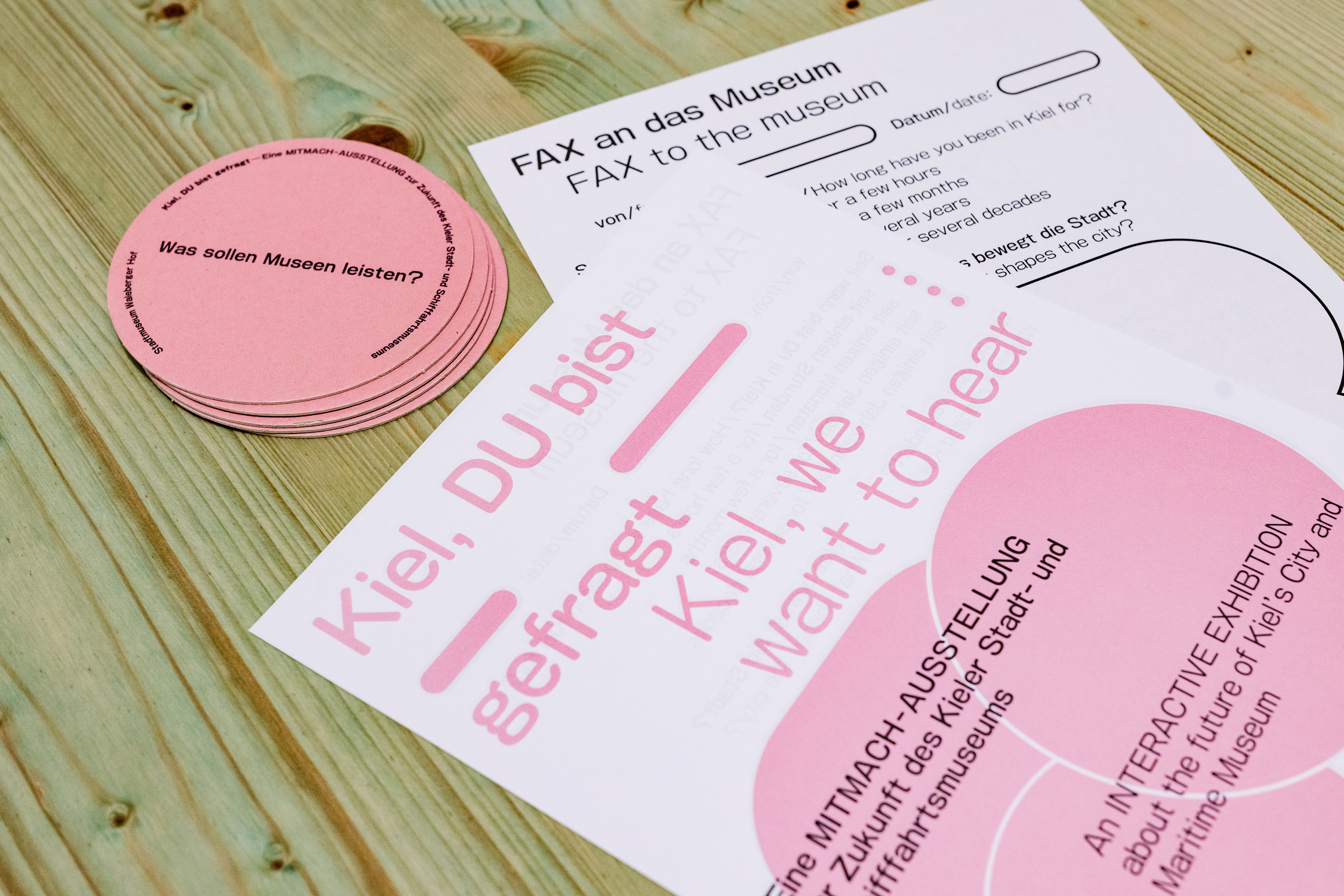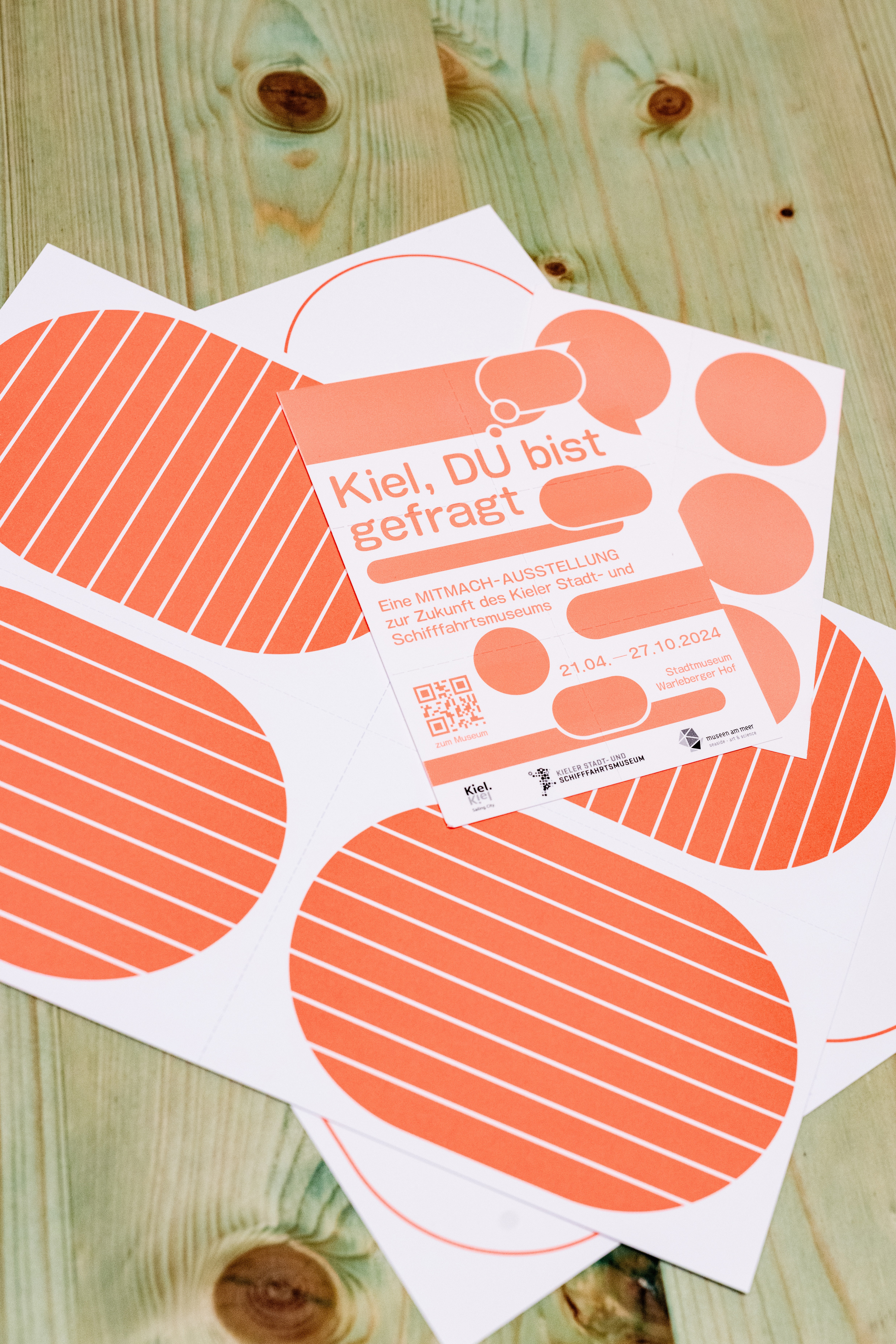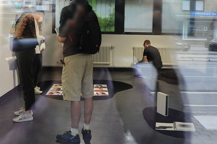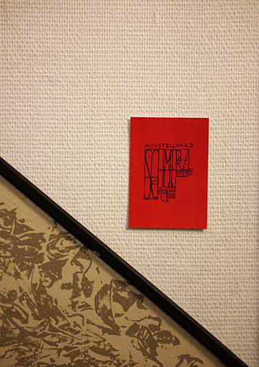 Die Flyer wurden von einer vergangenen Ausstellung wiederverwertet. Mit Siebdruck wurden alte Informationen über- und neue Informationen dazu gedruckt.