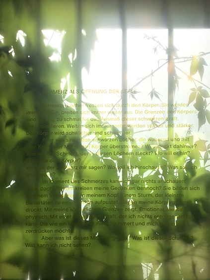 ‹Your healing view› will aber auch auf die bestehenden Qualität, den Blick in die Ferne, des Treppenhauses hinweisen. Your healing window macht auch die veränderte Wahrnehmung von Schmerzpatient*innen sichtbar. Die Patient*innen können aktiv entscheiden, wo sie ihren Blick hinwenden möchten. Brauchen sie Schutz vor der Sonne und Privatsphäre oder wollen sie ihren Blick in die Ferne schweifen lassen. Die Patient*innen haben die Wahl. Die Patient*innen sollen sich als Teil des Ganzen verstehen. Im besten Fall soll die Intervention einen heilenden Moment mit sich bringen.